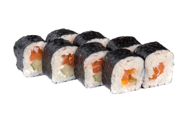 Состав: Лосось, сливочный сыр, огурец, красная икра, рис, нори.