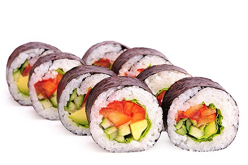Состав: Огурец, томат, лист салата, болгарский перец, авокадо, рис, нори.
